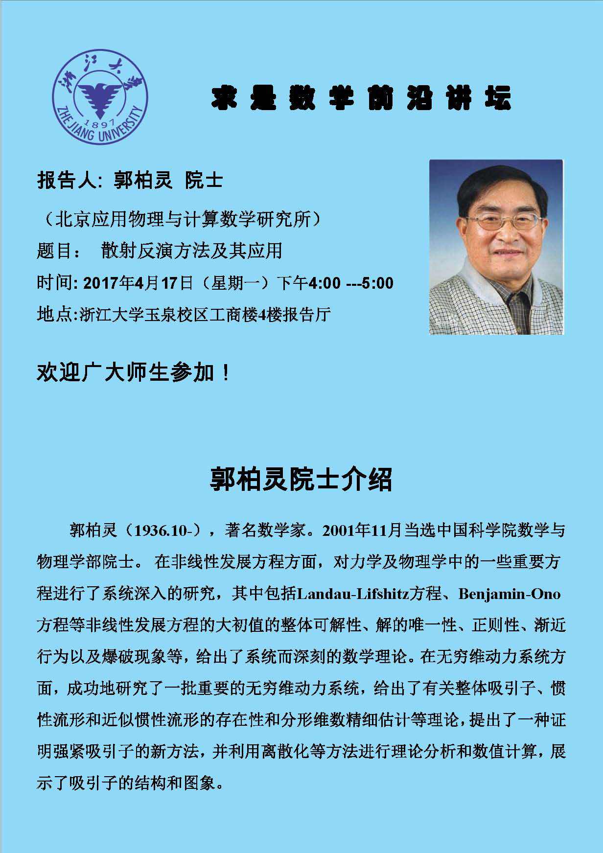 学术科研 学术团队 学术活动 学术会议 学术报告 讨论班 School Colloquium 信息公告 文件汇编 学术报告 乐竞APP在线登录 > 求是数学前沿讲坛之郭柏灵院士讲座 来源:乐竞体育官方app下载 发布时间:2017-04-14 1103