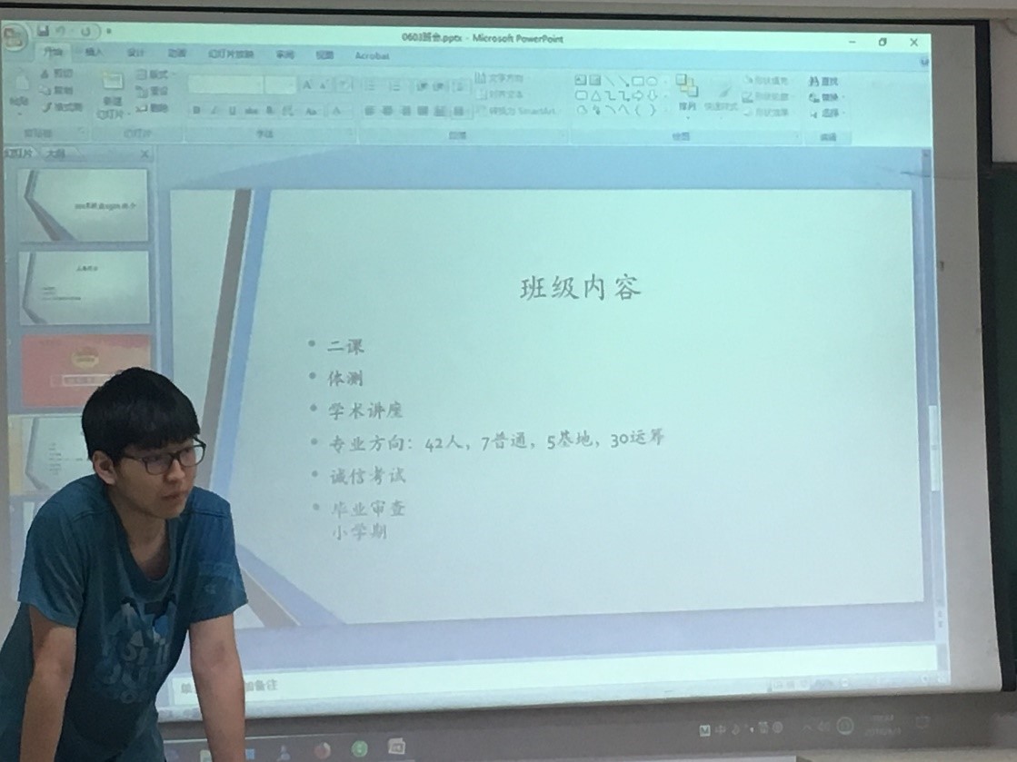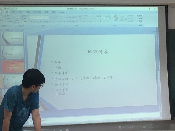 在接下来的班团建设板块中,班长首先再次强调了诚信考试的重要性,然后就一些同学们关注的问题如二课问题,体侧问题,学术讲座问题,专业方向统计数据等内容上为同学们进行了详细的解答。