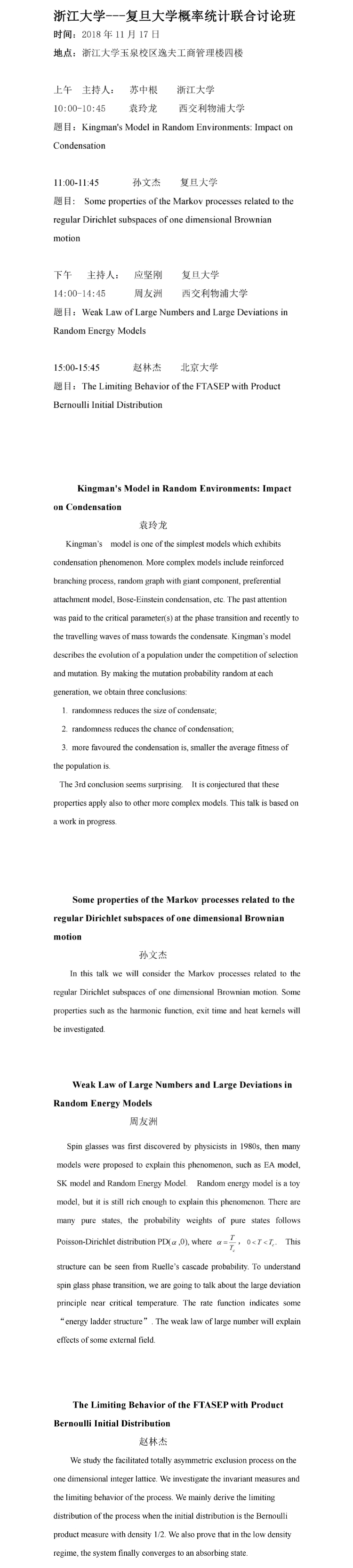 学术科研 学术团队 学术活动 学术会议 学术报告 讨论班 School Colloquium 信息公告 文件汇编 2018 乐竞APP在线登录 > 浙江大学---复旦大学概率统计联合讨论班 来源:乐竞体育官方app下载 发布时间:2018-11-04 1015 联系人:赵敏智 zhaomz@zju.edu.cn