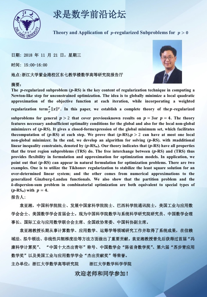 学术科研 学术团队 学术活动 学术会议 学术报告 讨论班 School Colloquium 信息公告 文件汇编 2018 乐竞APP在线登录 > 求是数学前沿论坛之袁亚湘院士讲座 来源:乐竞体育官方app下载 发布时间:2018-11-20 783