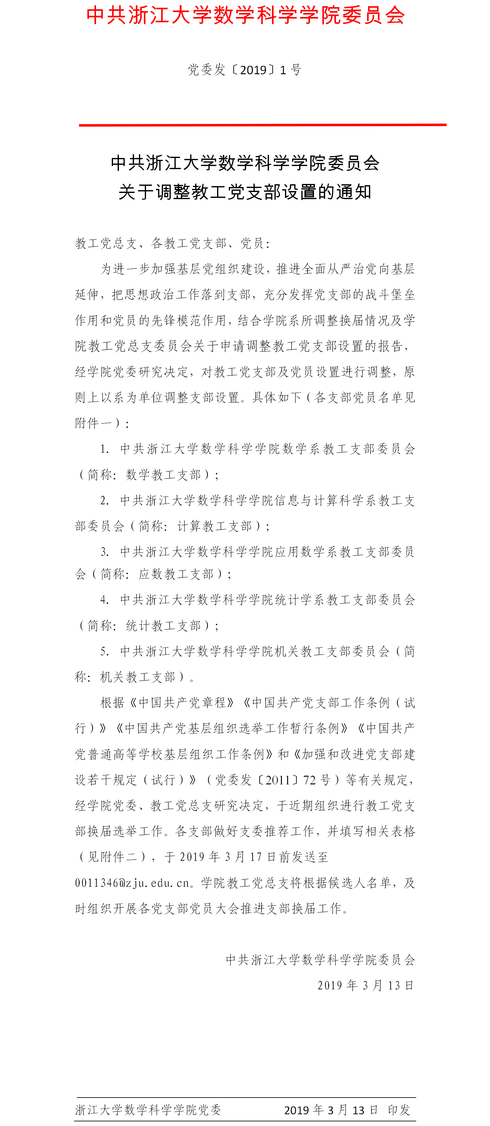 党群学工 党委概况 党建工作 文件汇编 团学通知 团学新闻 就业信息 评奖评优 学生资助 学生文件资料 规章制度 教工之家 党建工作 乐竞APP在线登录 > 中共乐竞APP在线登录委员会关于调整教工党支部设置的通知 来源:乐竞体育官方app下载 发布时间:2019-03-13 1136 附件一:各教工支部党员名单 附件二:乐竞体育官方app下载教工党支部委员推荐表