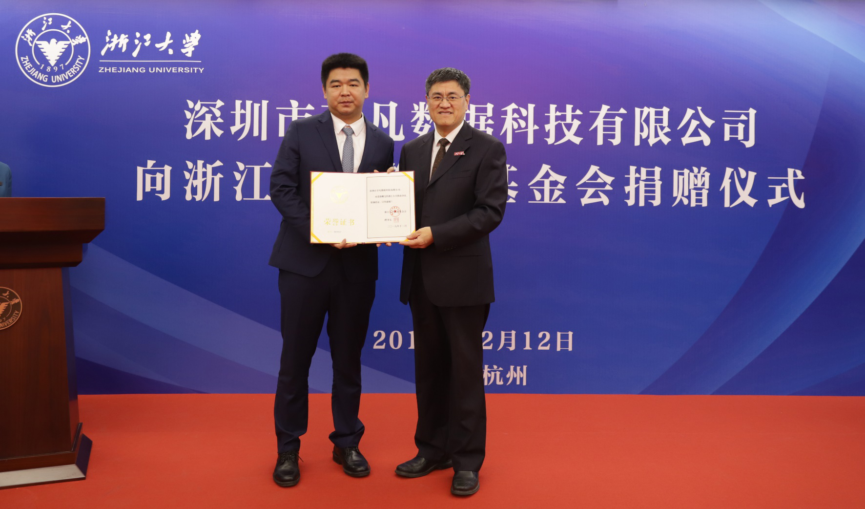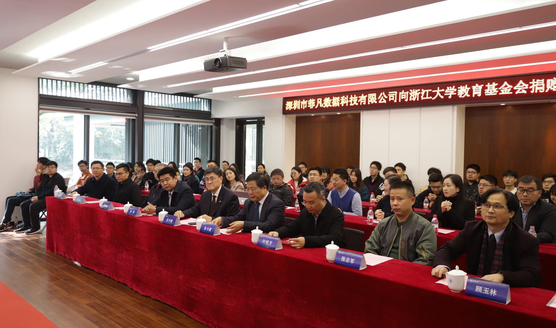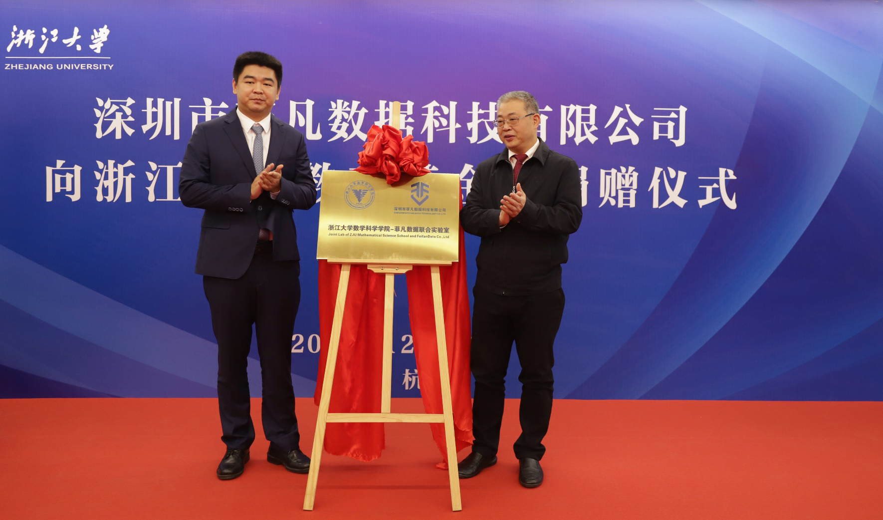 12月12日上午,深圳市菲凡数据科技有限公司向浙江大学教育基金会捐赠仪式在紫金港校区数学高等研究院举行。原中信银行行长、党委书记,中国行为法学会金融法律行为研究会会长朱小黄,深圳市菲凡数据科技有限公司董事长孙伟、副总经理张志军、姚崇,浙江大学党委书记、教育基金会理事长任少波,校党办校办主任叶桂方、发展联络办公室主任、教育基金会秘书长沈黎勇,教育基金会副秘书长顾玉林,乐竞体育官方app下载党委书记闻继威、副院长盛为民、党委副书记姚晨,以及学校相关党政管理部门的负责人、乐竞体育官方app下载的师生代表出席本次仪式。