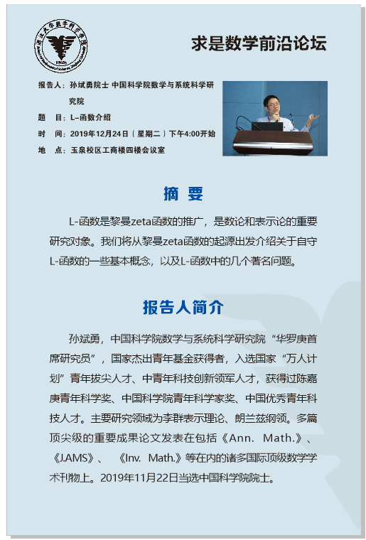 通知公告 通知公告 重要通知 本科生 研究生 科研 教学 人事 公示 学术活动 学术会议 新闻图片 院系新闻 院内邮件 重要通知 乐竞APP在线登录 > 求是数学前沿论坛之孙斌勇院士讲座 来源:乐竞体育官方app下载 发布时间:2019-12-18 1026