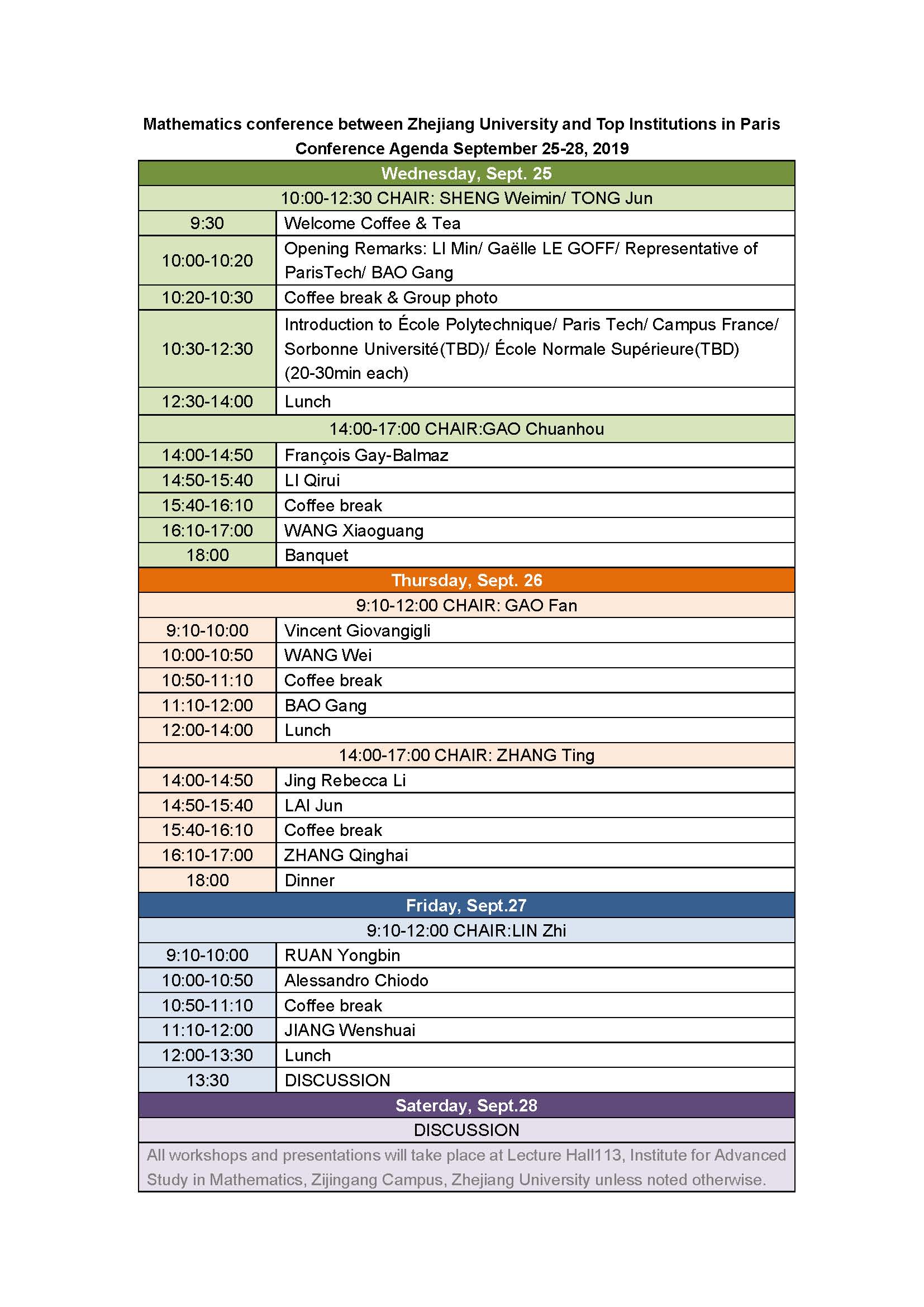 •Goal: French mathematics ranks amongthe top in the world. By 2018, French mathematicians account for 12 of thetotal 60 Fields Medal Winners. Almost all of the Fields Laureates have studiedor taught in Paris, making the top institutions there the cradle of the world’sbest mathematicians. ZJU is one of the top universities in China, withexcellent students and a distinguished tradition of mathematical research.ZJU’s "Chen-Su School" in the 1940s enjoys a high reputation in theinternational mathematical community. Currently, ZJU is striving to become aworld-class university with first-class mathematics. This forum aims to promoteall-round, strategic cooperation and exchange between ZJU and the topinstitutions in Paris in mathematical education and research.