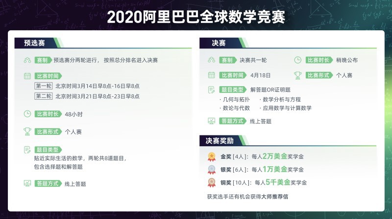 通知公告 通知公告 重要通知 本科生 研究生 科研 教学 人事 公示 学术活动 学术会议 新闻图片 院系新闻 院内邮件 研究生 乐竞APP在线登录 > 关于2020年阿里巴巴全球数学竞赛启动报名的通知 来源:乐竞体育官方app下载 发布时间:2020-03-06 5089 各位同学大家好:2020年阿里巴巴全球数学竞赛已经全面开启接受报名,第一轮预选赛将于北京时间2020年3月14日早上8点开赛。下图是本届比赛的详细介绍。大赛报名地址:https://damo.alibaba.com/alibaba-global-mathematics-competition,请同学们积极参与,