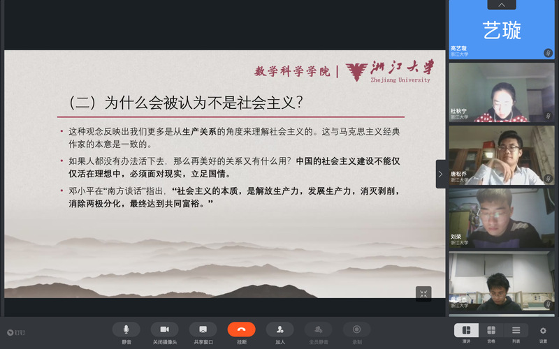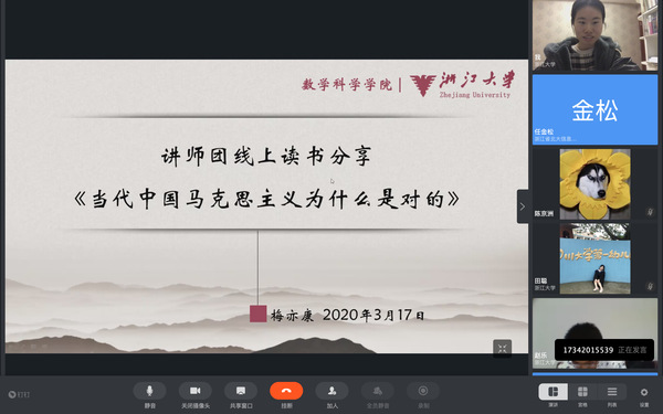 2020年3月17日晚8点,讲师团第二期线上读书交流会通过“浙大钉”平台,在线上顺利举行,交流会由讲师团团长唐梦迪同学主持,林怡雯和梅亦康两位同学作分享,讲师团所有成员共同参与,大家积极交流,线上讨论氛围热烈。