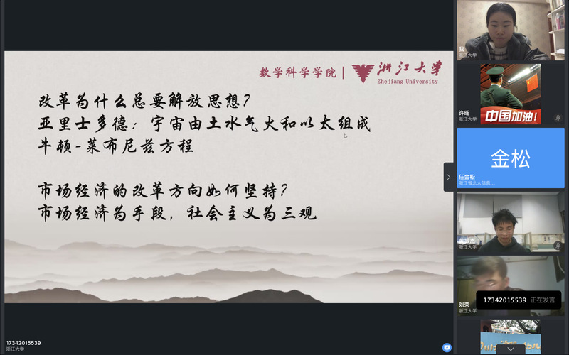 接下来是梅亦康同学带来的以第四章“改革的逻辑”为主题的分享。他先详细阐释了改革与革命的区别和联系,然后以我们数学专业熟悉的牛顿莱布尼兹方程为例,深入浅出地讲解了解放思想对于改革的重要性,最后和同学们一起讨论了市场经济的改革方向如何坚持、政治体制改革为什么这么难以及改革为什么只有进行时没有完成时这三个问题,同学们各抒己见,讨论地十分激烈。