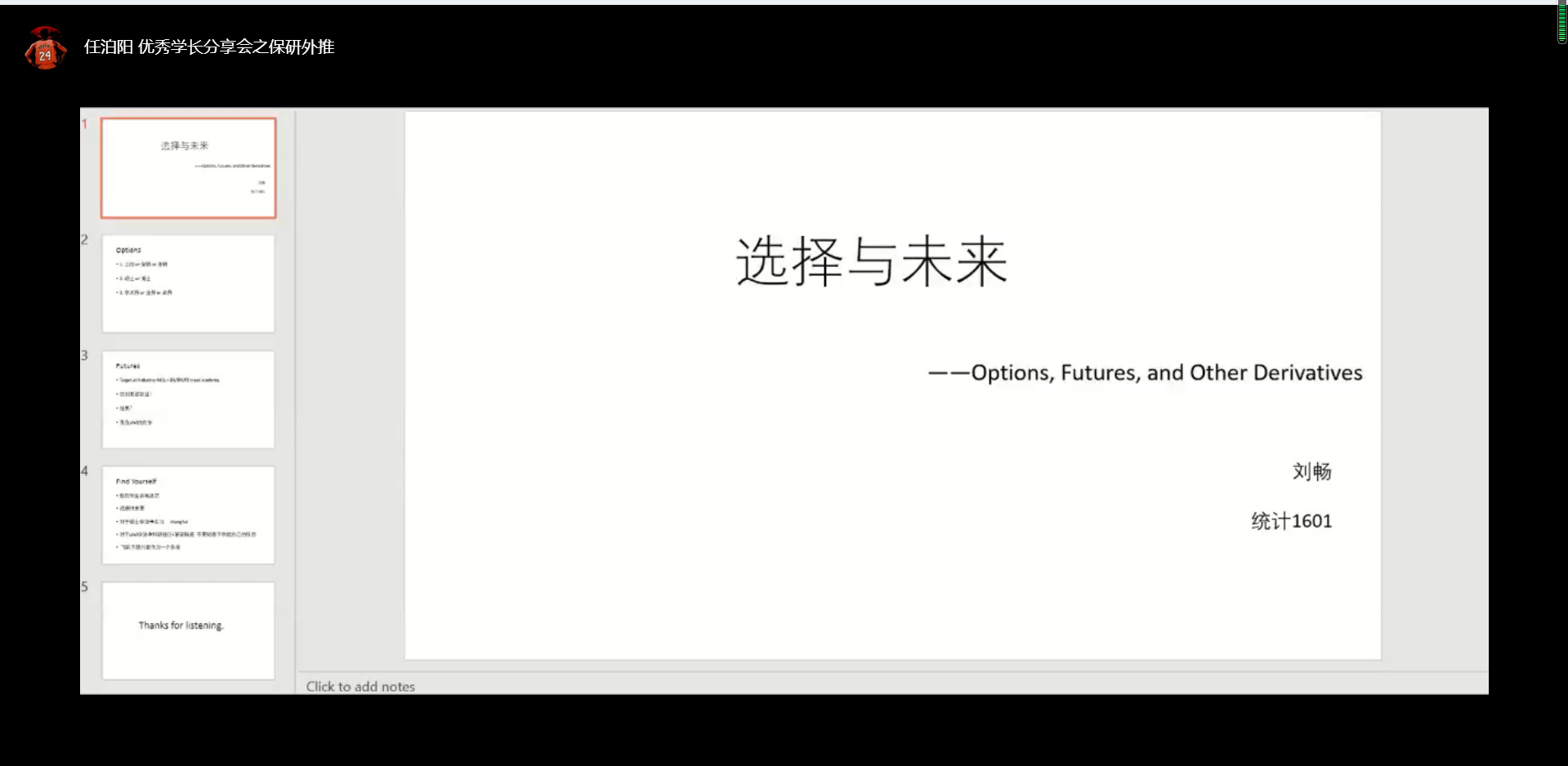 刘畅学长因为实习,以视频的方式进行了分享。他从个人经历出发,分享了进行升学方向选择的经验,对于出国留学和国内保研各有怎样的优劣。同时对于硕士和博士项目也有一定的解读。学长着重介绍了私募基金领域在国内的潜力,以及DS/BA项目在国内的发展前景。同时对于进行实习城市的选择,学长建议可以同时考虑上海等具有丰富相关资源的地区,分析比较了北京、上海、深圳等地的特点。让同学们从新的角度了解了相关内容。