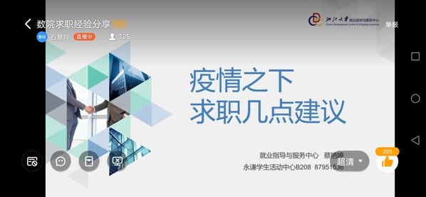 为贯彻学校党委会和就业工作会精神,2020年4月18日,乐竞体育官方app下载求职生涯发展专题分享会通过钉钉直播顺利举行,会议由学院辅导员石慧玲主持,邀请了就业指导与服务中心综合办公室副主任蔡艳婷老师,以及已获得不同工作领域offer的优秀数院学子进行技能指导和经验分享。他们是:签约腾讯科技(深圳)有限公司的甘伟男、签约淘宝(中国)软件有限公司的高璇、签约杭州市余杭高级中学的熊焕焕。