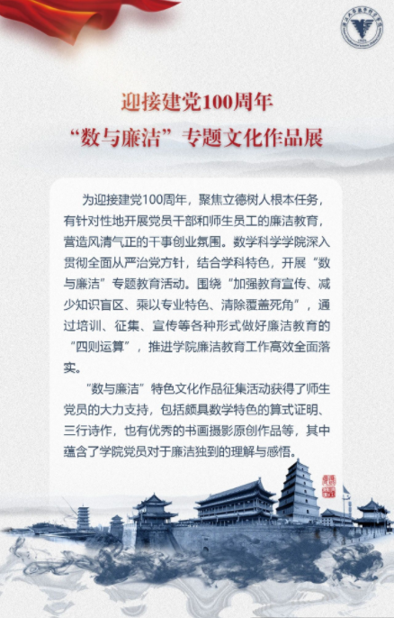 党群学工 党委概况 党建工作 文件汇编 团学通知 团学新闻 就业信息 评奖评优 学生资助 学生文件资料 规章制度 教工之家 团学新闻 乐竞APP在线登录 > 【迎接建党100周年】乐竞体育官方app下载“数与廉洁”专题文化作品展 来源:乐竞体育官方app下载 发布时间:2021-01-26 151