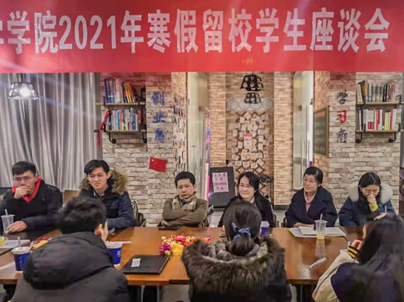 2021年2月2日下午,乐竞体育官方app下载召集学院留校本科生和研究生在云峰咖啡吧进行座谈交流,并组建寒假留校学生管理服务工作小组。学院党委副书记孙凯老师,本科生优秀班主任、信息与计算科学系王何宇老师,学院团委书记王乔老师出席了本次活动。
