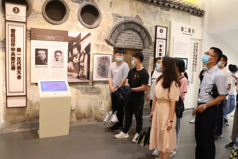 实践团一行随后来到中共浙江省“一大”旧址,简朴的木制二层建筑“冠尖新楼”中,记录着革命战争时期的老一辈党员同志们在内外敌人压迫下,坚持斗争、不畏牺牲的红色记忆。在旧址旁的陈列馆内,师生们重温了老一辈共产党人艰辛困苦却光辉璀璨、热血激昂的岁月,陈列馆里革命英雄塑像昂首挺胸、高风峻节的形象,使师生们深刻感受到革命先烈“为有牺牲多壮志,敢叫日月换新天”的大无畏革命精神和爱国主义情怀。