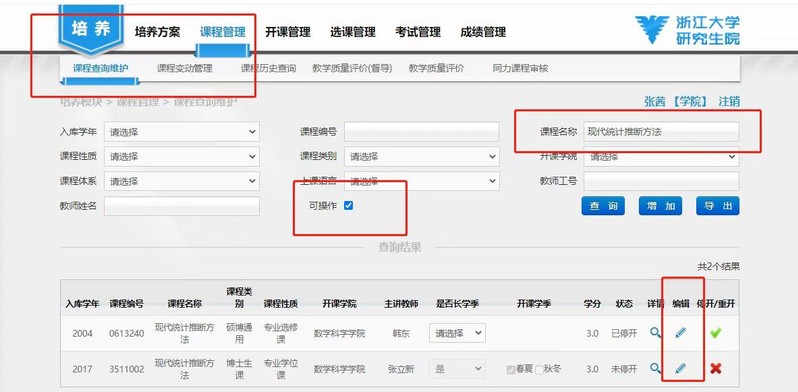 请各位老师登录研究生教务系统http://grs.zju.edu.cn/py/page/college/kccxwh.htm,登录时请使用统一身份认证进行登录,登录后路径为:培养-课程管理-课程查询维护(勾选可操作按钮),在弹出的课程条目中点击“编辑”按钮,进行课程大纲修订,修订完成后点击提交。如想停开某门课程,则在弹出的课程条目中点击“停开”按钮。