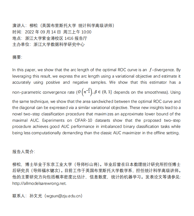 学术科研 学术团队 学术活动 学术会议 学术报告 讨论班 School Colloquium 信息公告 文件汇编 2022 乐竞APP在线登录 > Estimating the Arc Length of the Optimal ROC Curve and Lower Bounding the Maximal AUC 来源:乐竞体育官方app下载 发布时间:2022-09-14 334