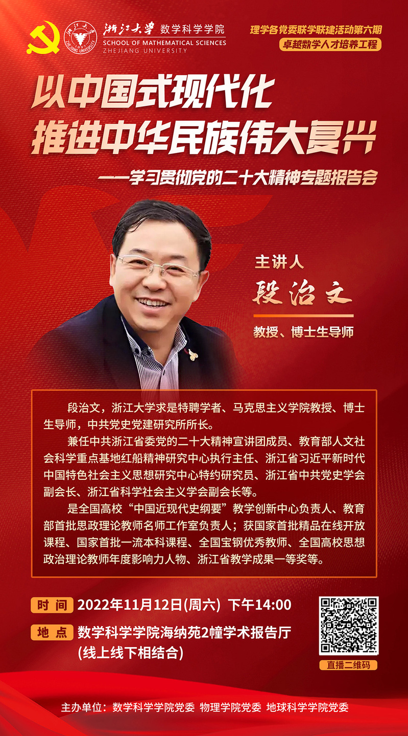为深化落实党中央及上级党组织、学校党委关于学习宣传贯彻党的二十大精神的部署,深入学习、深刻领会党的二十大的重大意义和二十大报告的深刻内涵,用新思想指导新发展阶段“双一流”建设和发展数学科学学院将学习宣传贯彻党的二十大精神作为当前和今后的一项重要政治任务,以更高的政治站位和政治自觉,全面系统开展学习贯彻落实党的二十大精神专题活动。联合理学各党委共同组织学习贯彻党的二十大精神专题报告会,本次活动也系学院卓越数学人才培养工程、党员“先锋学子”专题教育、党团学骨干专题培训等活动重要环节,现将活动具体安排通知如下: