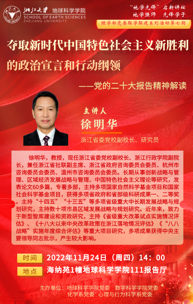 为深化落实党中央及上级党组织、学校党委关于学习宣传贯彻党的二十大精神的部署,深入学习、深刻领会党的二十大的重大意义和二十大报告的深刻内涵,用新思想指导新发展阶段“双一流”建设和发展,数学科学学院将学习宣传贯彻党的二十大精神作为当前和今后的一项重要政治任务,以更高的政治站位和政治自觉,全面系统开展学习贯彻落实党的二十大精神专题活动。由地球科学学院牵头,联合理学各党委共同组织学习贯彻党的二十大精神专题报告会,本次活动也系学院党员“先锋学子”专题教育等活动重要环节,现将活动具体安排通知如下:
