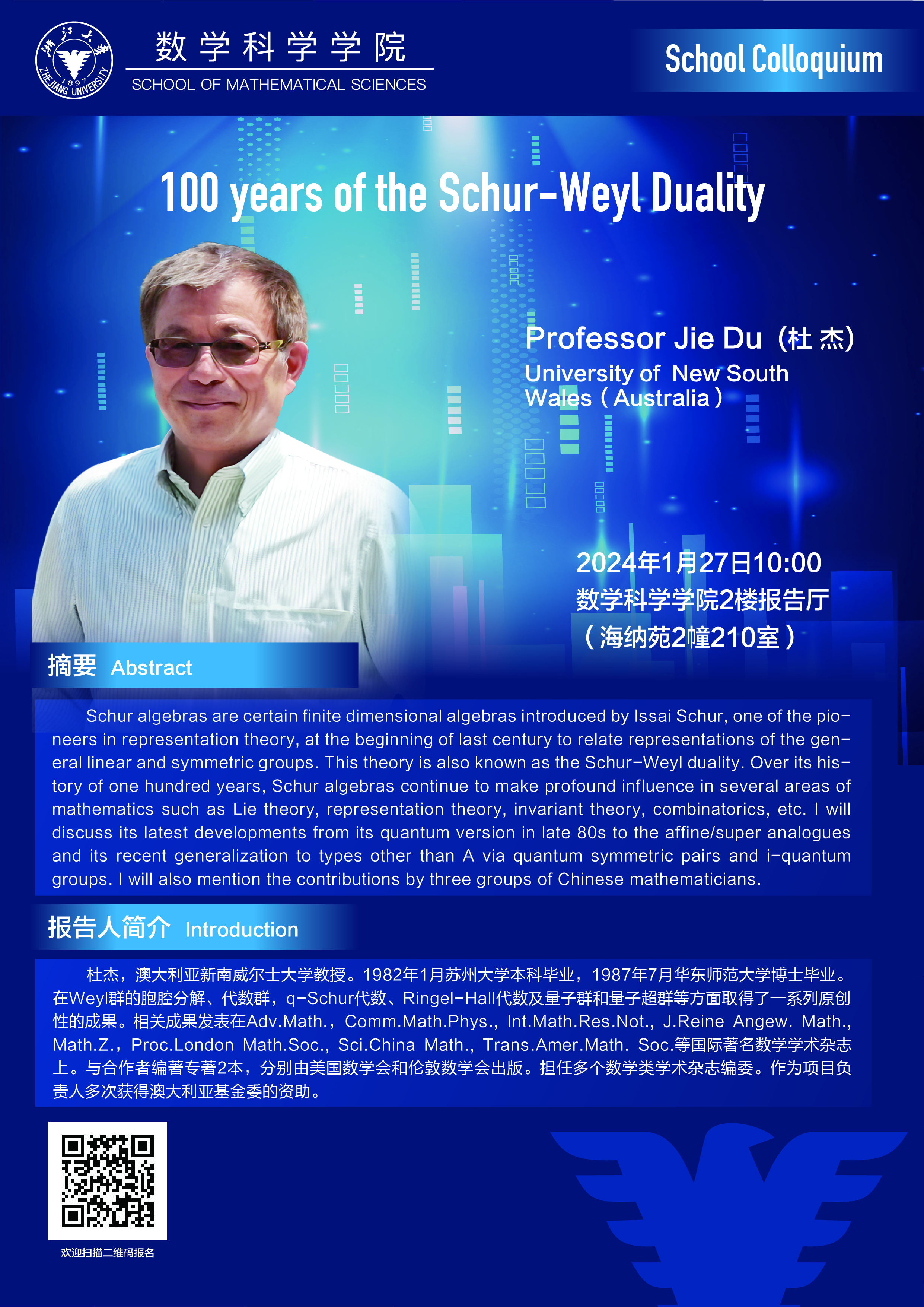 通知公告 通知公告 学术活动 学术会议 新闻图片 院系新闻 院内邮件 2024 乐竞APP在线登录 > School Colloquium——100 years of the Schur-Weyl Duality 来源:乐竞体育官方app下载 发布时间:2024-01-16 442