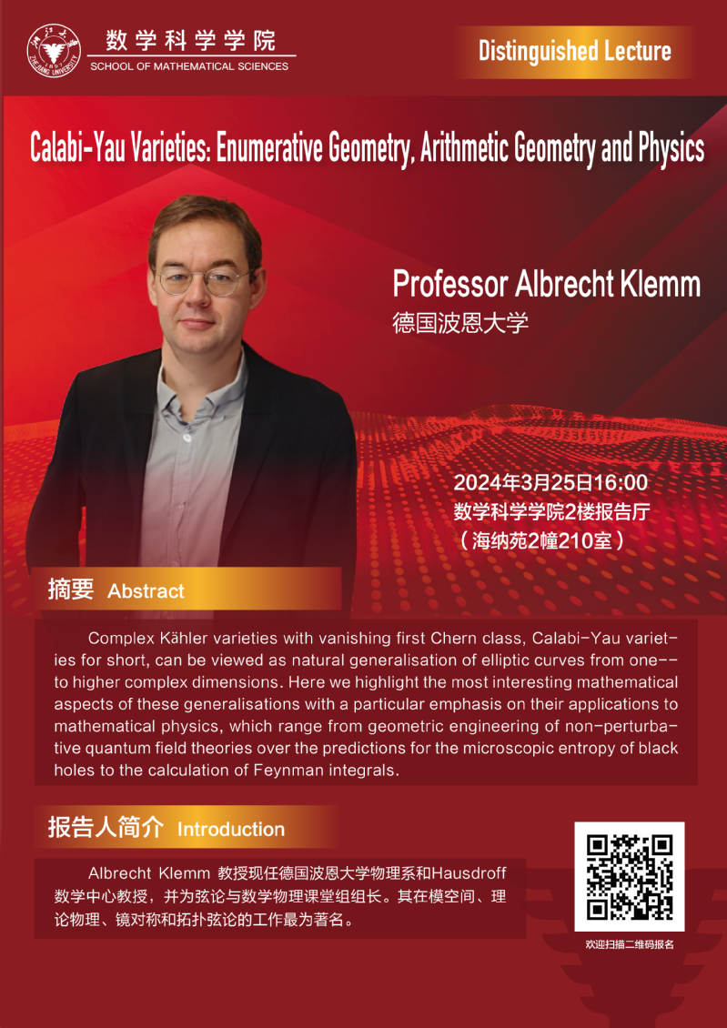 学术科研 学术团队 学术活动 学术会议 学术报告 讨论班 School Colloquium 信息公告 文件汇编 School Colloquium 乐竞APP在线登录 > Calabi-Yau Varieties: Enumerative Geometry, Arithmetic Geometry and Physics 来源:乐竞体育官方app下载 发布时间:2024-03-20 111