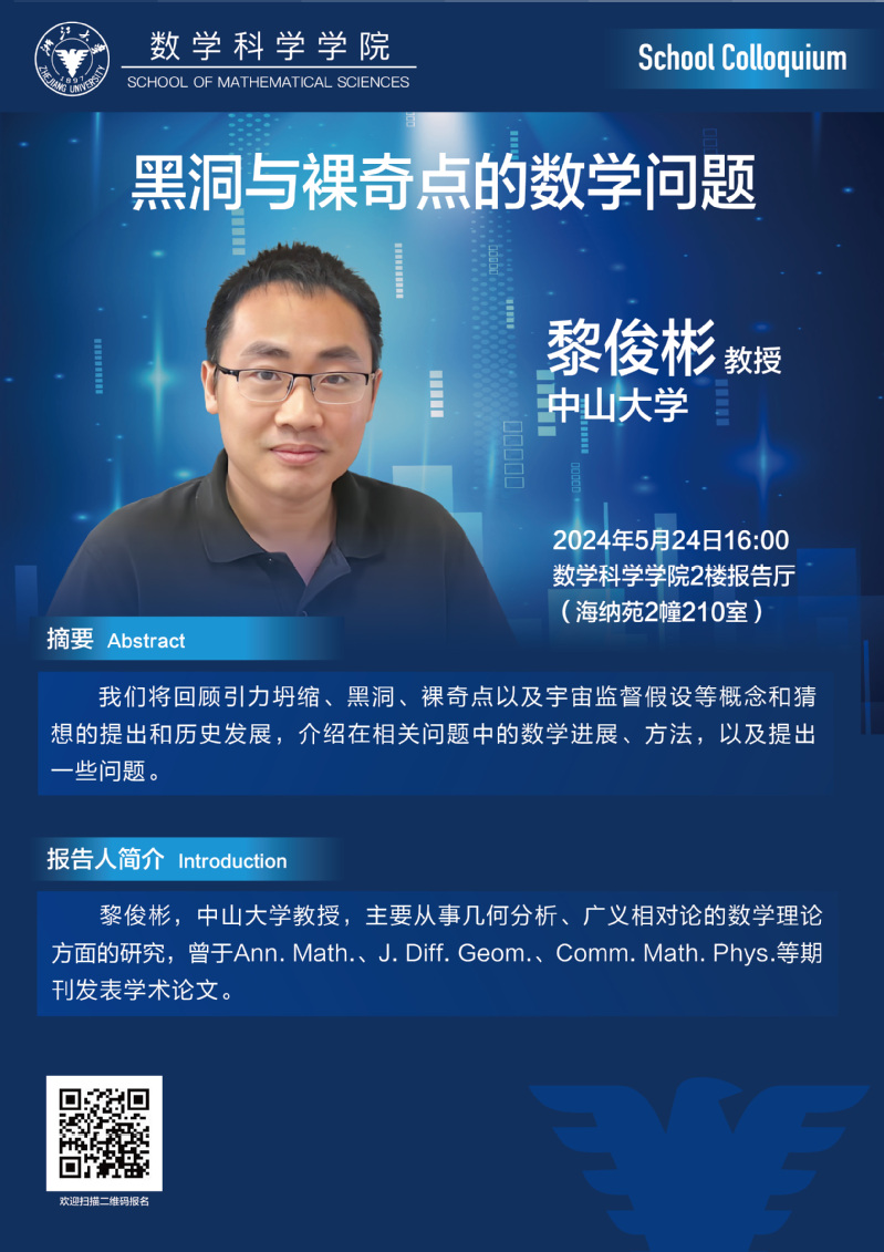 通知公告 通知公告 学术活动 学术会议 新闻图片 院系新闻 院内邮件 2024 乐竞APP在线登录 > School Colloquium——黑洞与裸奇点的数学问题 来源:乐竞体育官方app下载 发布时间:2024-05-21 320