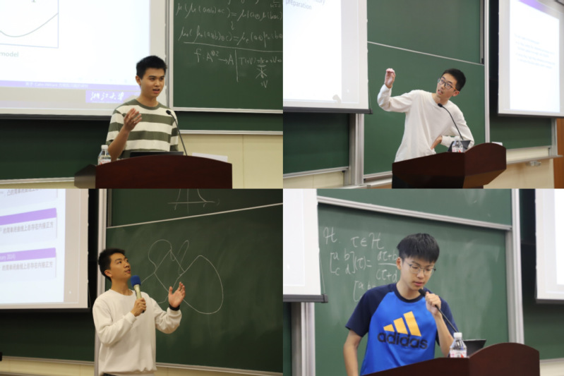 随后,华东师范大学20级和21级数学强基拔尖班学生王啸颖和李一九、浙江大学20级强基班张皓祥和21级求是科学班朱致远分别围绕代数变形理论、内接正方形问题、方程反问题研究和拉格朗日四方定理进行了科研分享。两校学生也围绕科研经历、课程学习、数学讨论班、深造方向等感兴趣的问题展开了热烈深入的交流探讨。