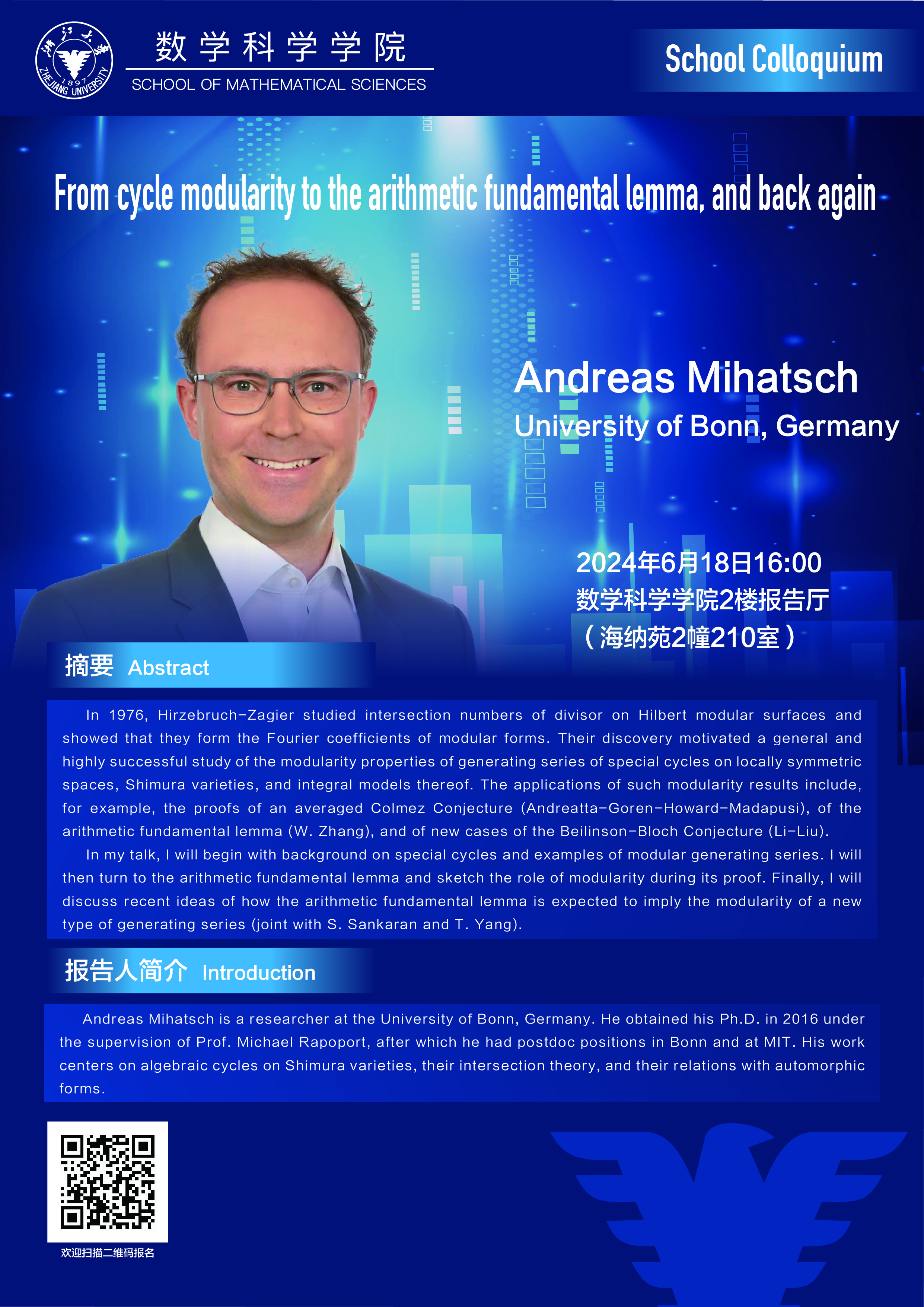 通知公告 通知公告 学术活动 学术会议 新闻图片 院系新闻 院内邮件 2024 乐竞APP在线登录 > School Colloquium——From cycle modularity to the arithmetic fundamental lemma, and back again 来源:乐竞体育官方app下载 发布时间:2024-06-17 266