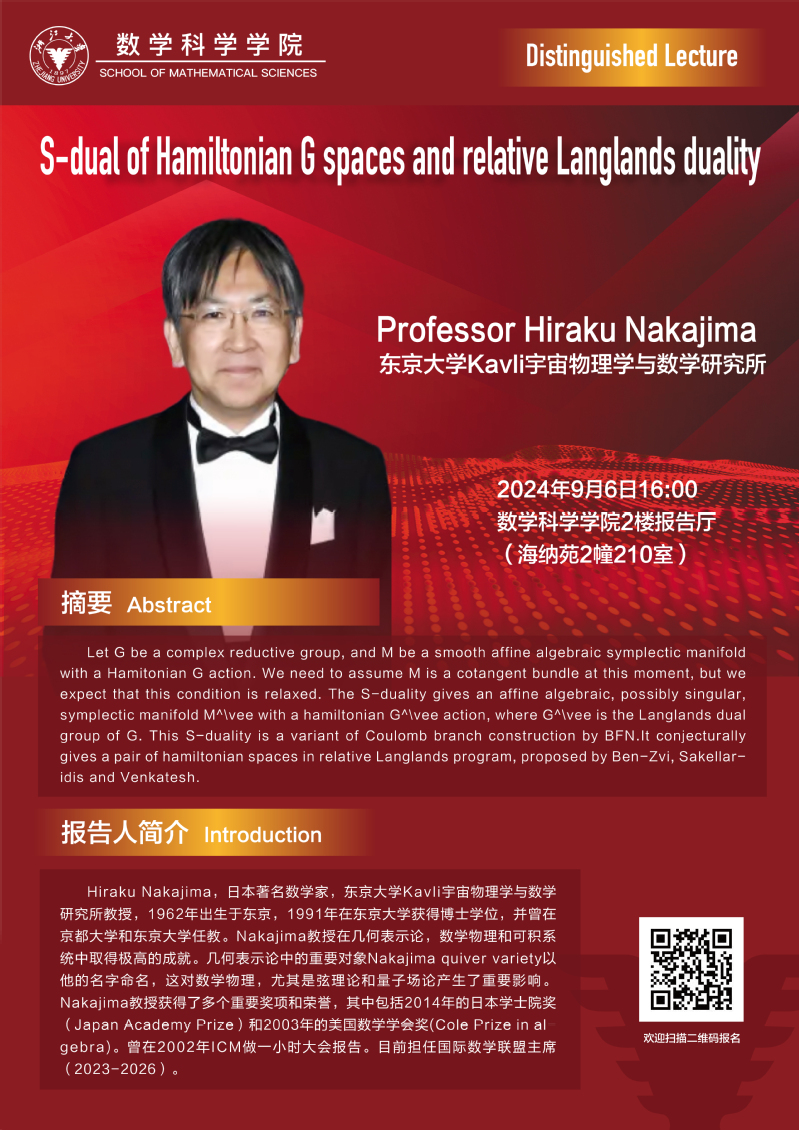 通知公告 通知公告 学术活动 学术会议 新闻图片 院系新闻 院内邮件 2024 乐竞APP在线登录 > Distinguished Lecture——S-dual of Hamiltonian G spaces and relative Langlands duality 来源:乐竞体育官方app下载 发布时间:2024-09-02 244