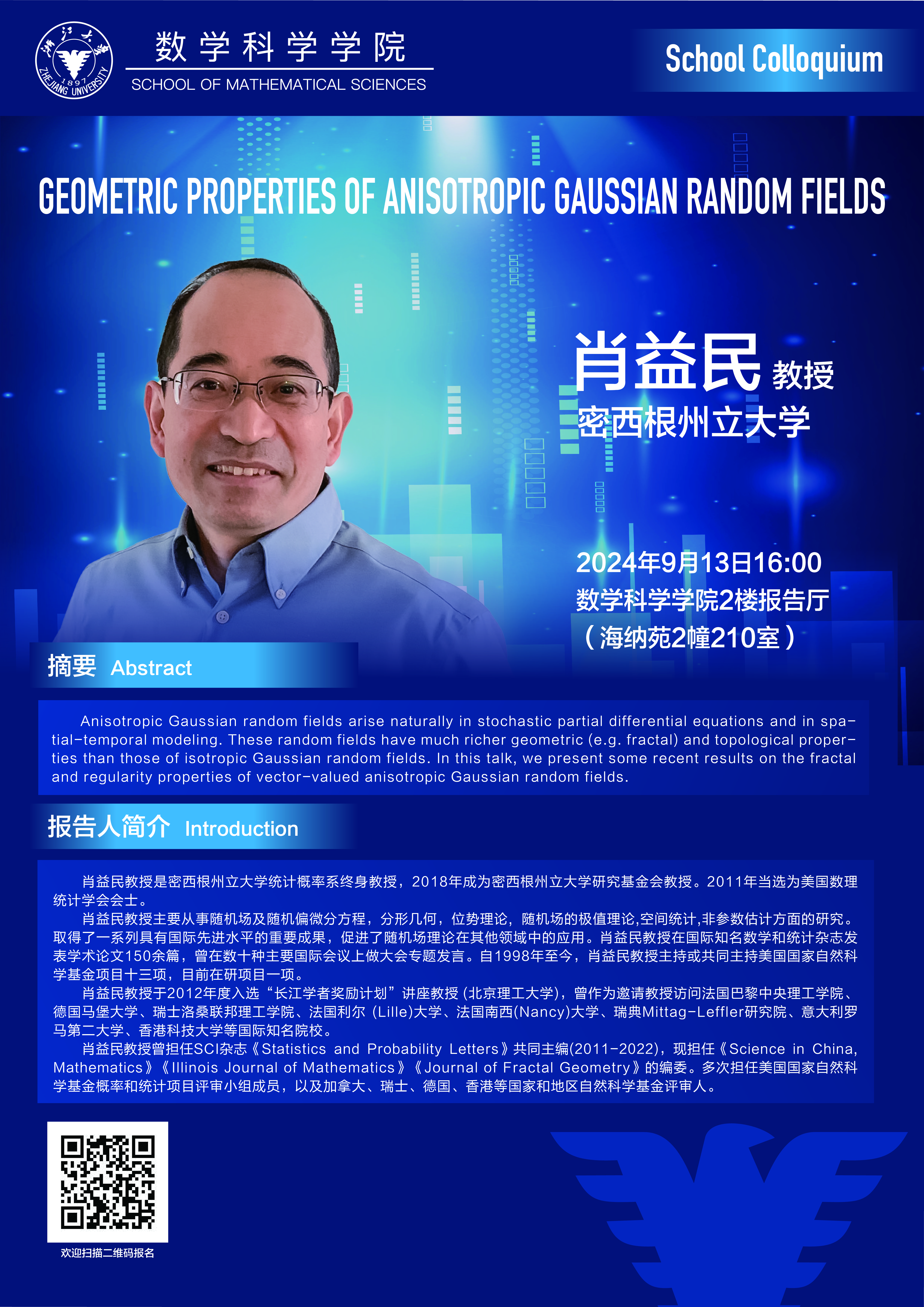 学术科研 学术团队 学术活动 学术会议 学术报告 讨论班 School Colloquium 信息公告 文件汇编 学术活动 乐竞APP在线登录 > School Colloquium——GEOMETRIC PROPERTIES OF ANISOTROPIC GAUSSIAN RANDOM FIELDS 来源:乐竞体育官方app下载 发布时间:2024-09-06 428