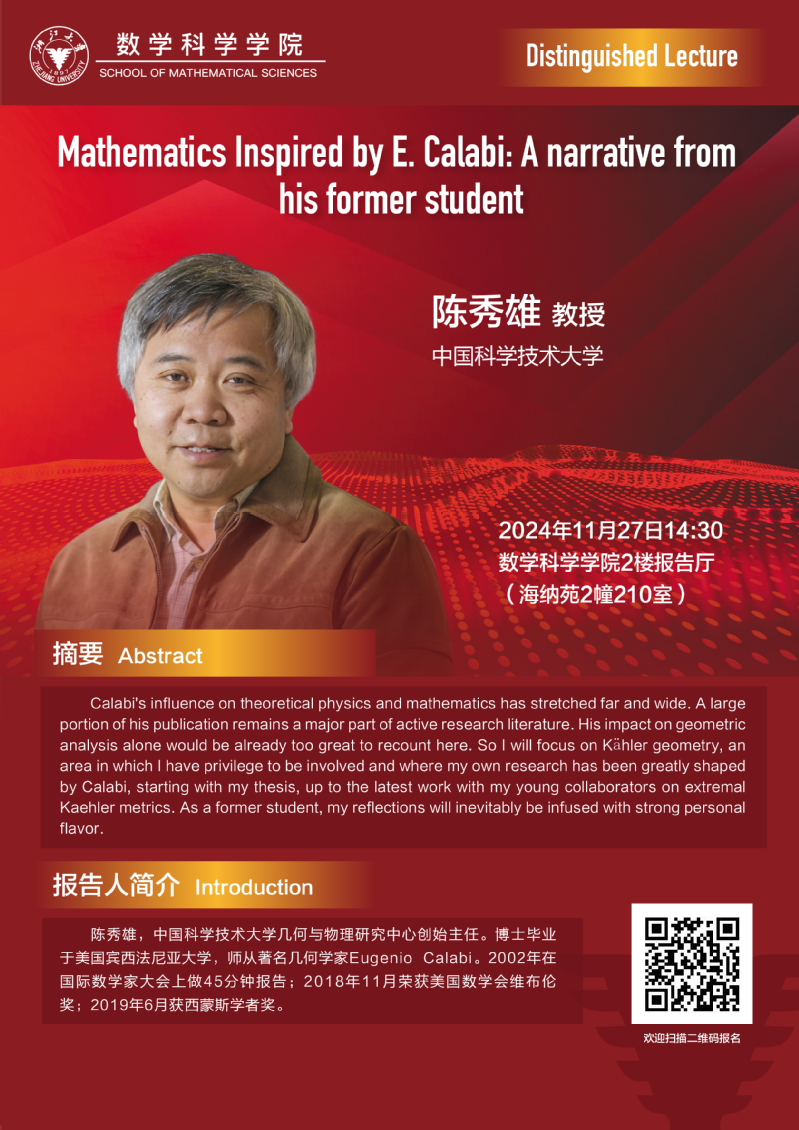 学术科研 学术团队 学术活动 学术会议 学术报告 讨论班 School Colloquium 信息公告 文件汇编 School Colloquium 乐竞APP在线登录 > Distinguished Lecture——Mathematics Inspired by E. Calabi: A narrative from his former student 来源:乐竞体育官方app下载 发布时间:2024-11-25 346