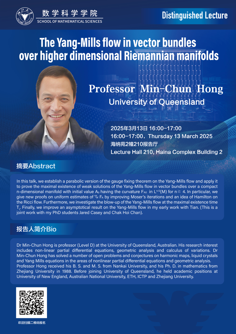 学术科研 学术团队 学术活动 学术会议 学术报告 讨论班 School Colloquium 信息公告 文件汇编 School Colloquium 乐竞APP在线登录 > Distinguished Lecture——The Yang-Mills flow in vector bundles over higher dimensional Riemannian manifolds 来源:乐竞体育官方app下载 发布时间:2025-03-10 25