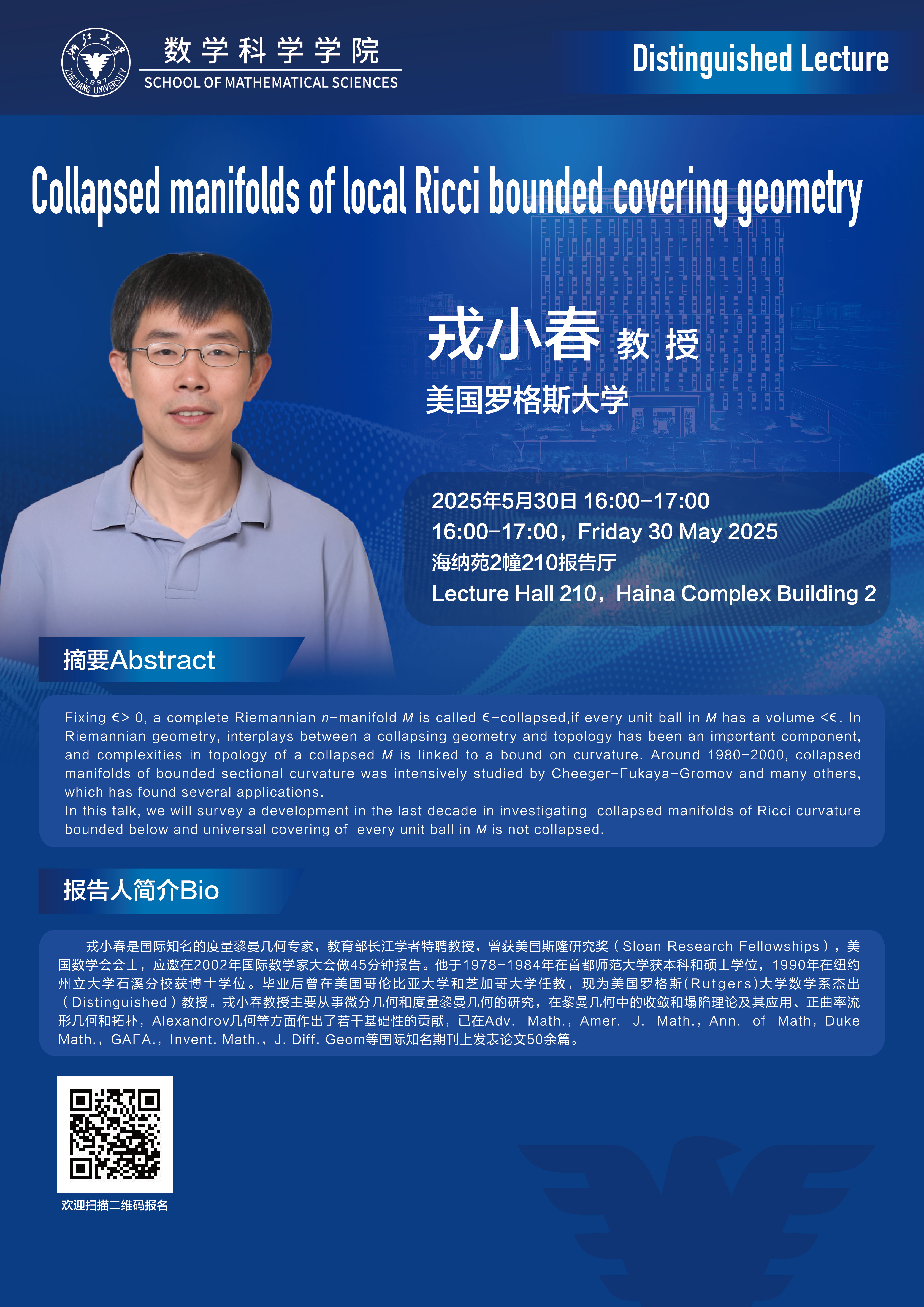 学术科研 学术团队 学术活动 学术会议 学术报告 讨论班 School Colloquium 信息公告 文件汇编 学术活动 乐竞APP在线登录 > Distinguished Lecture——Collapsed manifolds of local Ricci bounded covering geometry 来源:乐竞体育官方app下载 发布时间:2025-05-23 260