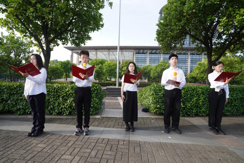 学生代表马畅、李睿、周钰棋、蔡政冲、潘炫宇等同学带来诗朗诵《数学人的精神与传承》,他们用铿锵的话语,生动诠释了浙大数学人“把论文写在祖国大地上”的家国情怀,许下青年学子“让青春在全面建设社会主义现代化国家的火热实践中绽放绚丽之花”的青春誓言。