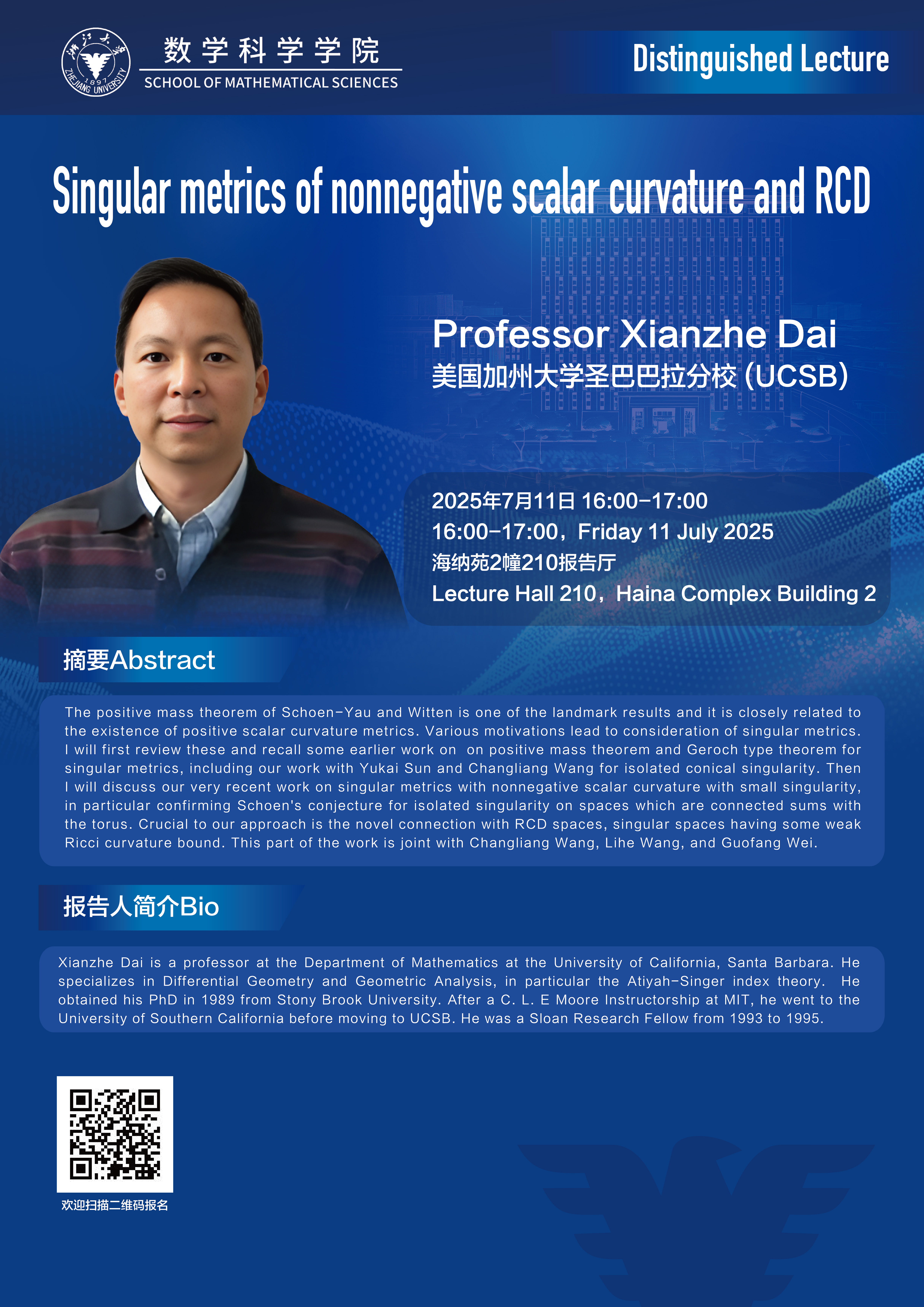 学术科研 学术团队 学术活动 学术会议 学术报告 讨论班 School Colloquium 信息公告 文件汇编 学术活动 乐竞APP在线登录 > Distinguished Lecture——Singular metrics of nonnegative scalar curvature and RCD 来源:乐竞体育官方app下载 发布时间:2025-07-09 350