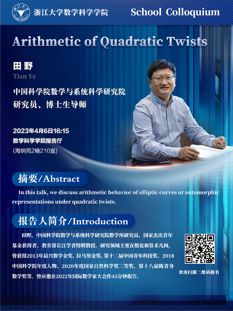 Seminars Seminars School Colloquium Conferences Position : homepage EVENTS Seminars School Colloquium——Arithmetic of Ouadratic Twists 2023-04-06 16:15:00 2023-04-06 16:15:00 2023-04-06 16:15:00 Speaker : 4:15PM, Tian Ye Time : 2023-04-06 16:15:00 Location : Date: 2023-04-06 Visitcount : 52
