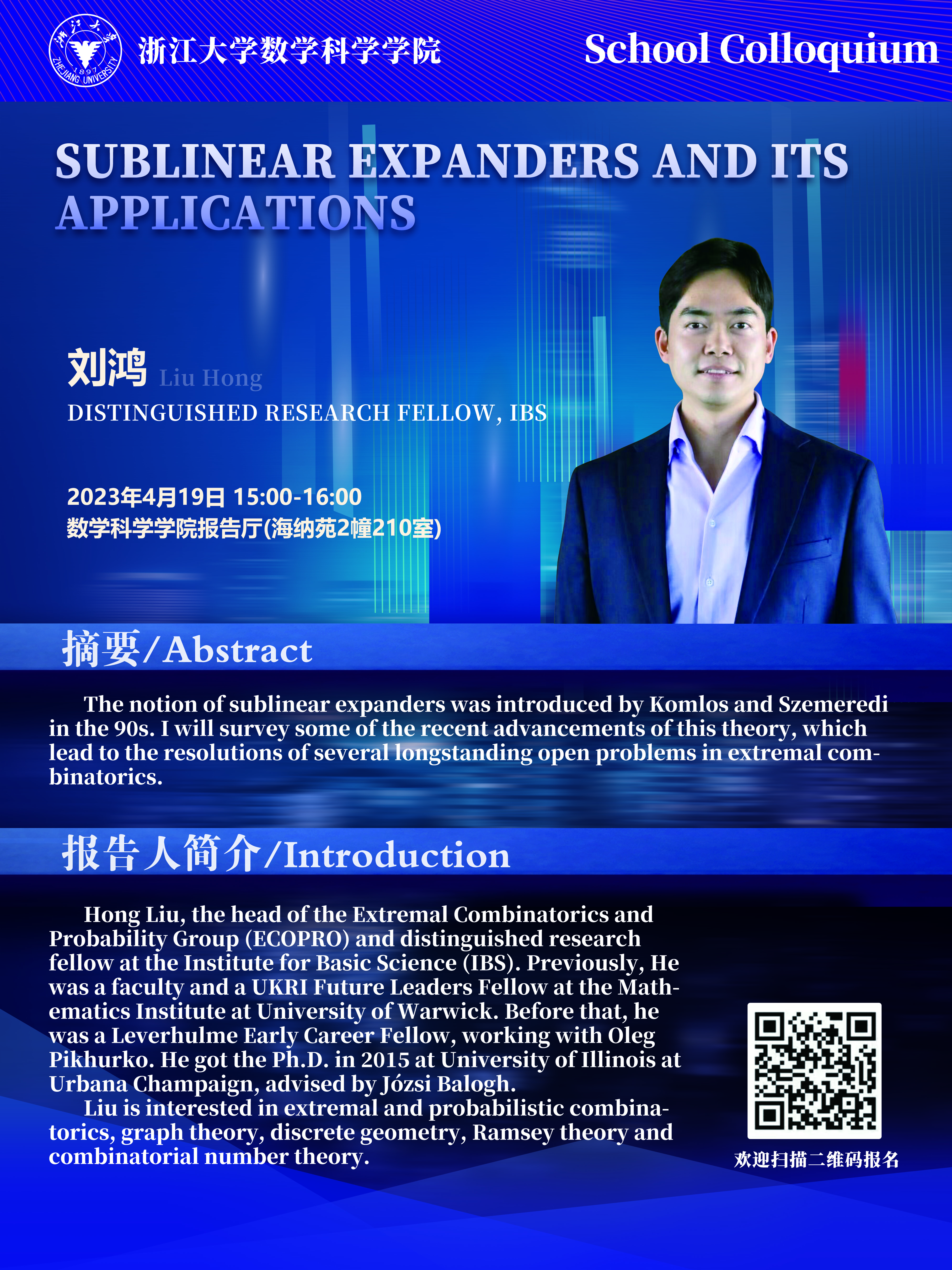 Seminars Seminars School Colloquium Conferences Position : homepage EVENTS Seminars School Colloquium:Sublinear expanders and its applications 2023-04-19 15:00:00 2023-04-19 15:00:00 2023-04-19 15:00:00 Speaker : Liu Hong, 3:00PM Time : 2023-04-19 15:00:00 Location : Date: 2023-04-19 Visitcount : 77