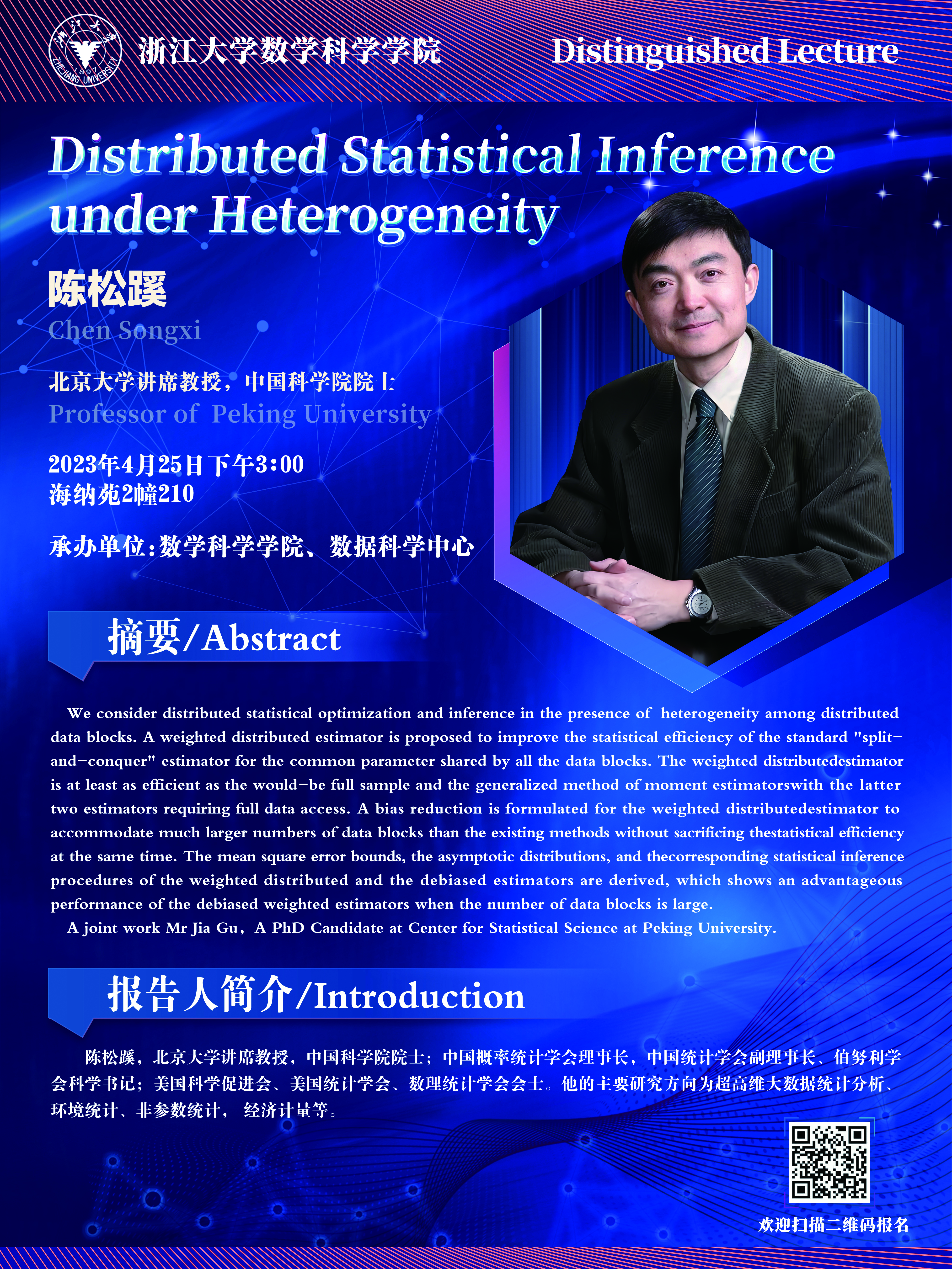 Seminars Seminars School Colloquium Conferences Position : homepage EVENTS Seminars Distinguished Lecture : Distributed Statistical Inference under Heterogeneity 2023-04-25 15:00:00 2023-04-25 15:00:00 2023-04-25 15:00:00 Speaker : 3:00PM, Chen Songxi Time : 2023-04-25 15:00:00 Location : Date: 2023-04-25 Visitcount : 88