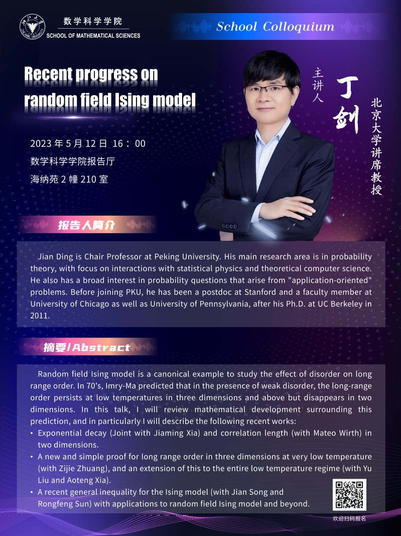 Seminars Seminars School Colloquium Conferences Position : homepage EVENTS Seminars School Colloquium: Recent progress on random field Ising model 2023-05-12 16:00:00 2023-05-12 16:00:00 2023-05-12 16:00:00 Speaker : 4:00PM, Ding Jian Time : 2023-05-12 16:00:00 Location : May Date: 2023-05-11 Visitcount : 91