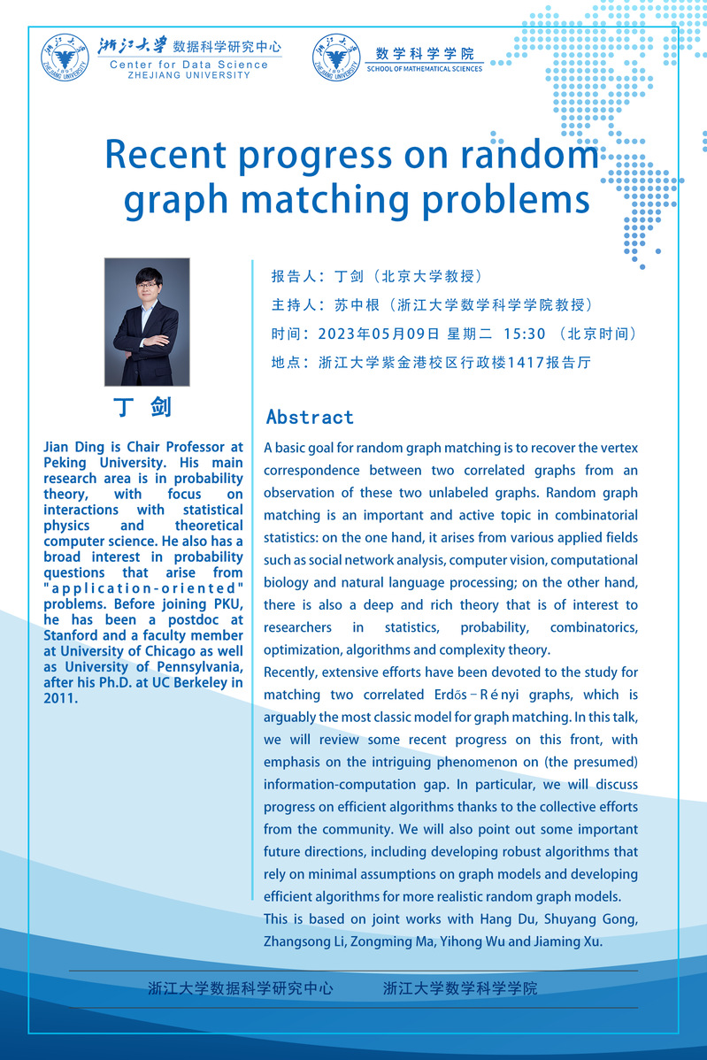 Seminars Seminars School Colloquium Conferences Position : homepage EVENTS Seminars Recent progress on random graph matching problems 2023-05-09 15:30:00 2023-05-09 15:30:00 2023-05-09 15:30:00 Speaker : 3:30PM, Ding Jian Time : 2023-05-09 15:30:00 Location : May Date: 2023-05-11 Visitcount : 110