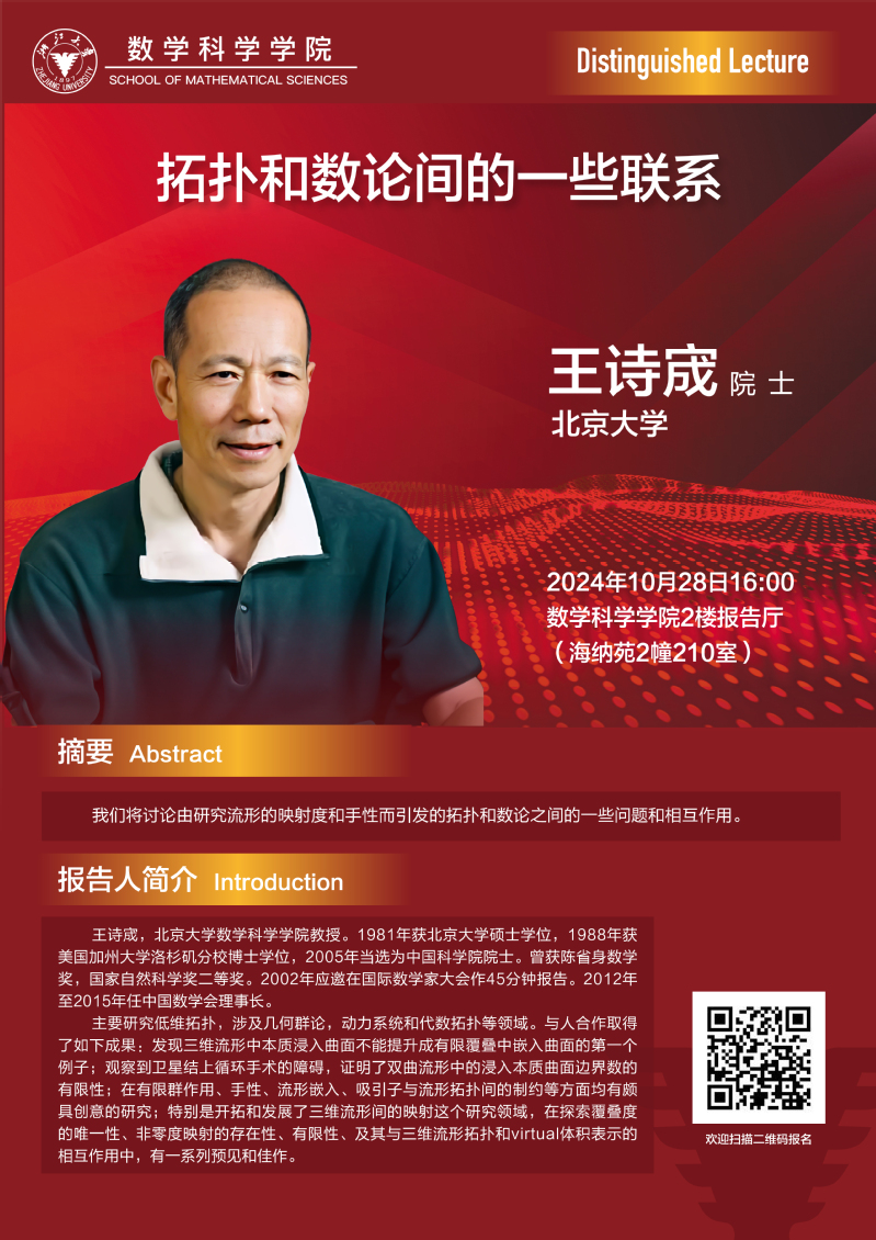 Seminars Seminars School Colloquium Conferences Position : homepage EVENTS Seminars Distinguished Lecture——拓扑和数论间的一些联系 2024-10-28 16:00:00 2024-10-28 16:00:00 2024-10-28 16:00:00 Speaker : Shicheng Wang; Peking University Time : 2024-10-28 16:00:00 Location : 210 Haina Complex Building 2(海纳苑) Date: 2024-10-24 Visitcount : 61