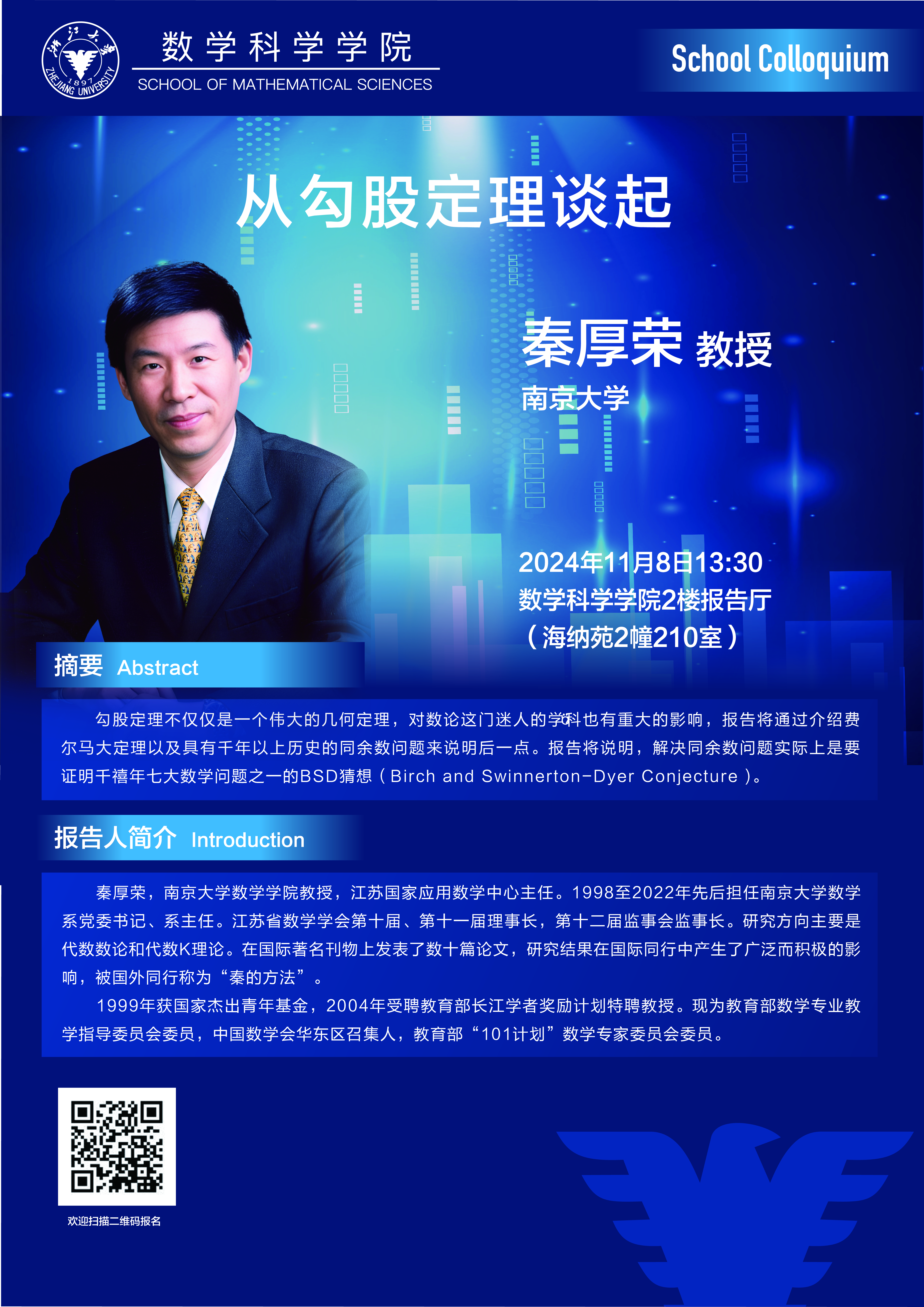 Seminars Seminars School Colloquium Conferences Position : homepage EVENTS Seminars School Colloquium——从勾股定理谈起 2024-11-08 13:30:46 2024-11-08 13:30:46 2024-11-08 13:30:46 Speaker : Hourong Qin, Nanjing University Time : 2024-11-08 13:30:46 Location : 210 Haina Complex Building 2(海纳苑) Date: 2024-11-04 Visitcount : 38