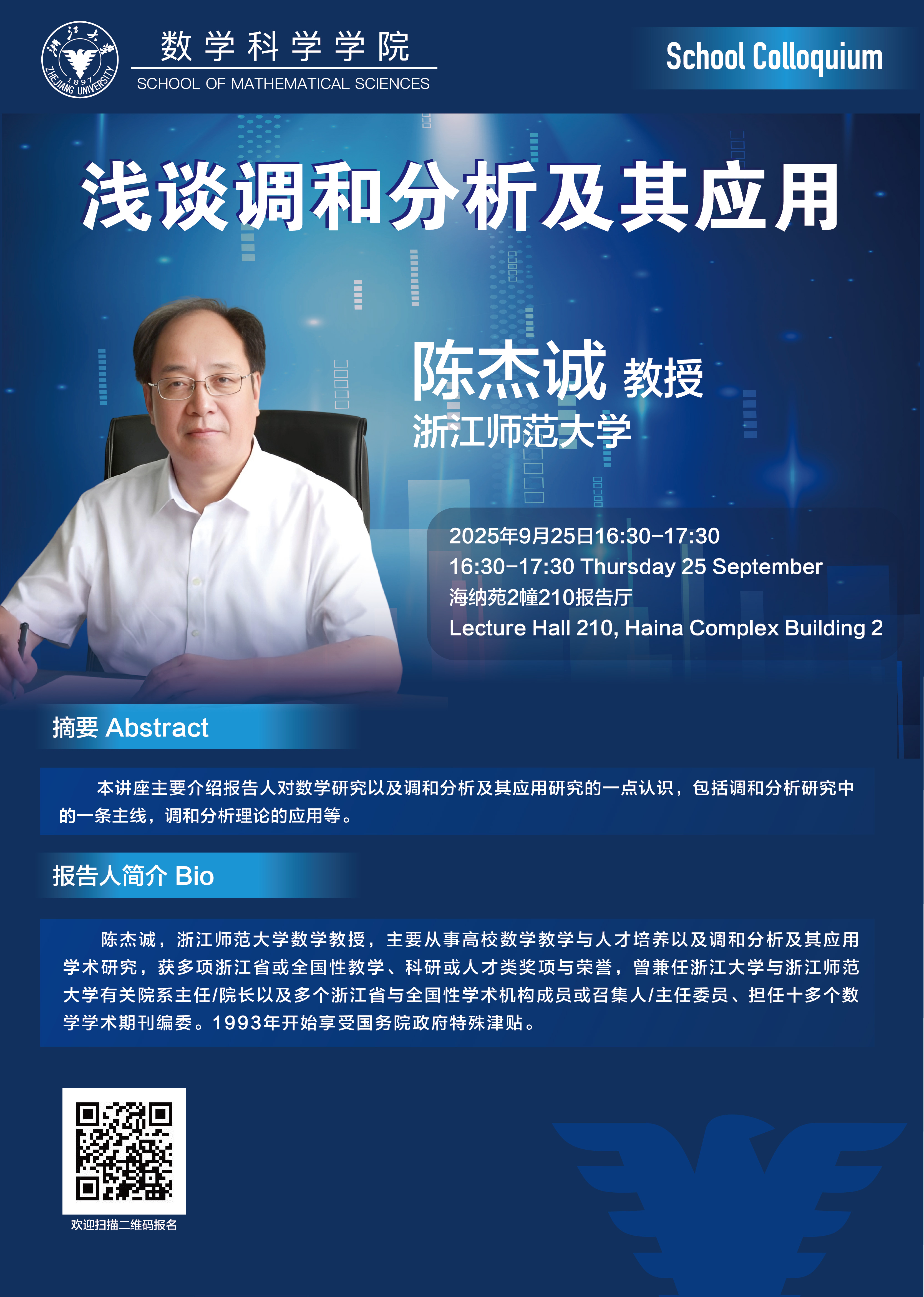 Seminars Seminars School Colloquium Conferences Position : homepage EVENTS Seminars 浅谈调和分析及其应用 2025-09-25 16:30:00 2025-09-25 16:30:00 2025-09-25 16:30:00 Speaker : Jiecheng Chen(Zhejiang Normal University) Time : 2025-09-25 16:30:00 Location : 210 Haina Complex Building 2 Date: 2025-09-22 Visitcount : 10